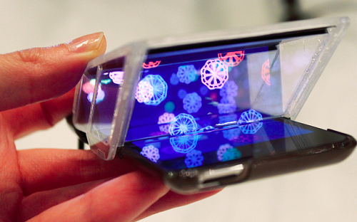所有關(guān)注 3D 技術(shù)的目光都在打印機(jī)上時(shí),這個(gè)來自日本 Tom Nagae / DIRECTIONS 公司的的掌上 3D 顯示屏回歸到最原始的光學(xué)原理來讓 iPhone 變成便攜 3D 影院。折疊起來時(shí),Pal Top Theater(掌上影院) 看上去像一個(gè)普通的手機(jī)殼。里面是有三塊鏡片組成:一塊大鏡片和兩塊成一定角度的小鏡片??瓷先シ浅:?jiǎn)單,但效果卻非常好。Palm Top Theater 有一個(gè)免費(fèi)的 app 供用戶下載,這個(gè)設(shè)備并不是支持 iPhone 上的所有電影,而是一種把電影畫面分成三層的特殊格式。 目前,iPhone 版的 Palm Top Theater 售價(jià)為 33 美元,Tom Nagae / DIRECTIONS 公司也已經(jīng)制作了 iPad 版顯示屏,但并沒有公開發(fā)售。