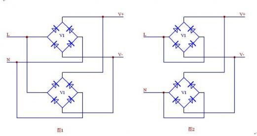 1、整流橋并聯(lián) 在小功率設(shè)計(jì)中,一般很少用到整流橋的并聯(lián),但在某些大功率輸出的情況下,不想增添新的器件單個(gè)整流橋電流又不滿足輸入功率要求,就需要用到整流橋的并聯(lián)了,整流橋的并聯(lián)不能采用兩個(gè)整流橋各自整流后直流并聯(lián)的方式,也就是不能采用圖1的方式,因?yàn)檎鳂驔]有配對,單純靠自身的V-I特性,一般是無法均流的,這樣就會造成兩個(gè)整流橋發(fā)熱不一致。而采用圖2的方式,通常認(rèn)為在一個(gè)封裝內(nèi)的兩個(gè)二極管是非常匹配的,是可以均分電流的,所以采用圖2的方式就可以實(shí)現(xiàn)整流橋的并聯(lián)了。
