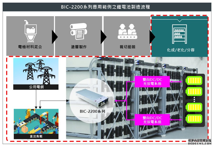 如下圖所示,電池生產(chǎn),從電極制作開始一直到出貨期間,部分制程需透過電池的充放電,以確保電池的功能與效能。所有制程中,以「化成」與「老化&分容」這兩大制程耗能最巨,其中「化成」更是影響電池質量的關鍵制程之一。在過去,電池生產(chǎn)線需采用一臺充電器搭配一臺逆變器,方能實現(xiàn)「化成」與「分容」兩個制程。此作法不僅占據(jù)較大的空間,整體成本也無法有效下降;越多原件也意味著維護成本升高,信賴度大幅降低。