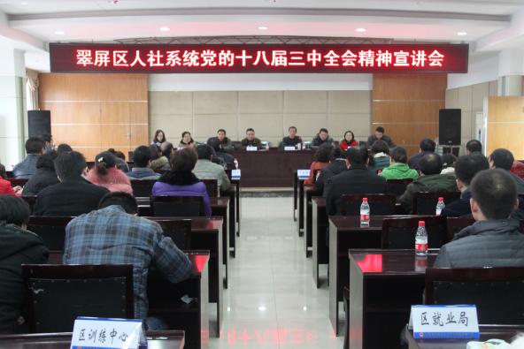 1月17日,翠屏區(qū)人社局在區(qū)總工會(huì)禮堂召開黨的十八屆三中全會(huì)精神宣講會(huì),局黨組書記劉祚文同志結(jié)合全區(qū)人社系統(tǒng)工作實(shí)際,對(duì)十八屆三中全會(huì)精神作了深入細(xì)致的宣講解讀。翠屏區(qū)人社局黨組成員、局機(jī)關(guān)干部職工、下屬單位班子成員及中層干部、退休職工代表等120余人參加會(huì)議。